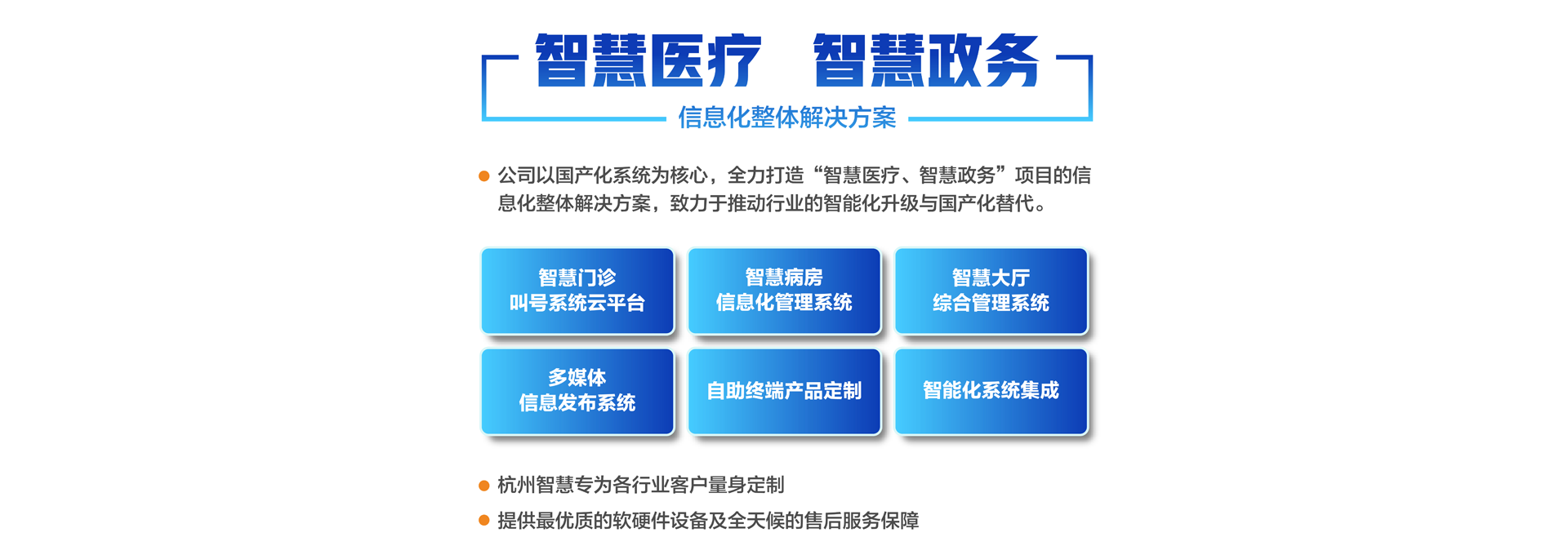 杭州智慧科技有限公司初創(chuàng)于2003年,總部位于重要的電子商務(wù)中心中國(guó)杭州公司主營(yíng)業(yè)務(wù)有:智慧分診叫號(hào)系統(tǒng)、智慧病房醫(yī)護(hù)對(duì)講系統(tǒng)、智慧大廳綜合管理系統(tǒng)、智慧政務(wù)管理系統(tǒng)、智慧多媒體信息發(fā)布系統(tǒng)、導(dǎo)診系統(tǒng)及各自助終端產(chǎn)品定制。專(zhuān)為各行業(yè)客戶(hù)量身定制。公司已有20余年行業(yè)經(jīng)驗(yàn)沉淀積累,擁有優(yōu)秀的產(chǎn)品外觀設(shè)計(jì)師和各類(lèi)中高級(jí)專(zhuān)業(yè)技術(shù)工程師,確保所研發(fā)的產(chǎn)品具有行業(yè)領(lǐng)先的外觀及可靠的技術(shù)性能。并擁有權(quán)威部門(mén)頒發(fā)的各類(lèi)知識(shí)產(chǎn)權(quán)及專(zhuān)利證書(shū),30多項(xiàng)資質(zhì)證書(shū)、800多個(gè)合作伙伴、2000多個(gè)項(xiàng)目成功案例經(jīng)驗(yàn)。 智慧產(chǎn)品已遍及全國(guó)各醫(yī)療、政務(wù)、金融、通訊、公安、工商、稅務(wù)等行業(yè),形成以“立足杭州、輻射長(zhǎng)三角、拓展全國(guó)”的戰(zhàn)略發(fā)展格局,產(chǎn)品經(jīng)過(guò)歷年不斷創(chuàng)新,形成專(zhuān)業(yè)化、平臺(tái)化,致力于成為智慧產(chǎn)品的領(lǐng)軍企業(yè)。 公司建立了完善的技術(shù)培訓(xùn)及售后服務(wù)中心,并設(shè)24小時(shí)熱線咨詢(xún)電話解答用戶(hù)反饋的問(wèn)題。同時(shí)應(yīng)客戶(hù)要求定期派技術(shù)人員到 全國(guó)各地進(jìn)行技術(shù)指導(dǎo)輔助用戶(hù)正確使用智慧產(chǎn)品并能獨(dú)立安裝、調(diào)試、日常維護(hù)等工作。提供最優(yōu)質(zhì)的設(shè)備及全天候的售后服務(wù)保障,智慧永恒不變的服務(wù)宗旨——致力于客戶(hù)的滿(mǎn)意與成功!...
